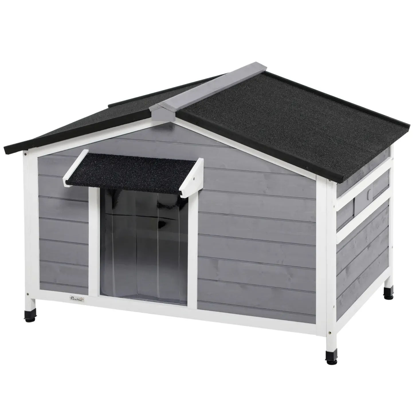 Ihr Hund wird diese PawHut-Hundehütte mit Sicherheit lieben. Das zu öffnende Dach ermöglicht es Ihnen, Ihren Hund zu streicheln, ihm einen Knochen zu geben und mit ihm zu spielen. Die Hütte verfügt über ein Wohnzimmer, in dem Ihr Haustier viel Platz zum Ausruhen hat. Die für den Außenbereich geeigneten Materialien aus Massivholz und das wasserabweisende Material sorgen für eine Qualität, die auch Regen übersteht. Das Design der Hütte hat ein niedliches Aussehen und ist stilvoll und funktional.